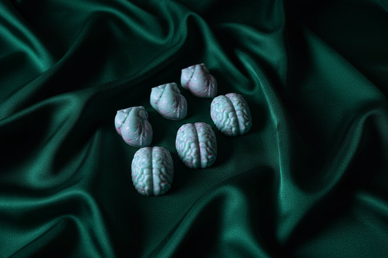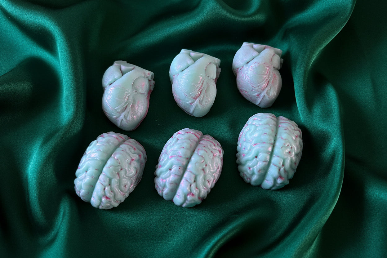 The Head or Heart wax melt set explores the eternal conflict between logic and emotion. Featuring a curated mix of three brain-shaped melts and three heart-shaped melts, this collection is designed for moments of reflection, ritual, and indulgence.